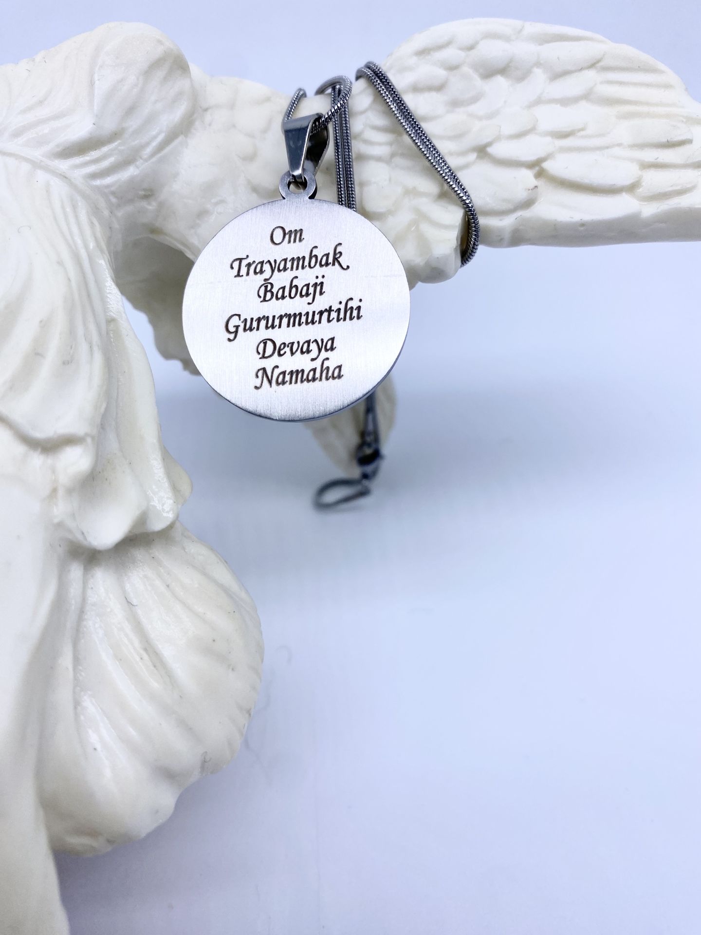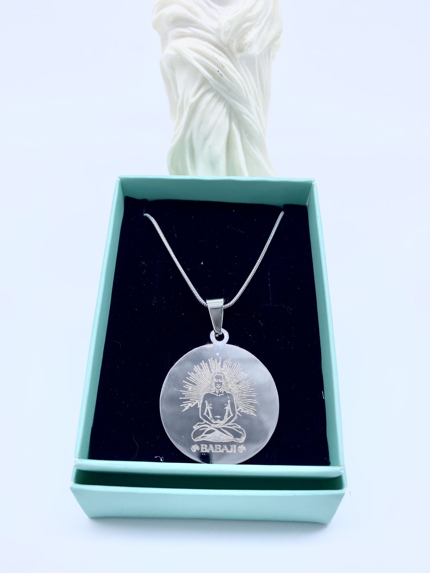 Bir yüzünde Babaji'nin resmi, diğer yüzünde Babaji'nin Kadim mantrası yer almaktadır. Kolye ucu da, zinciri de paslanmaz çeliktendir.