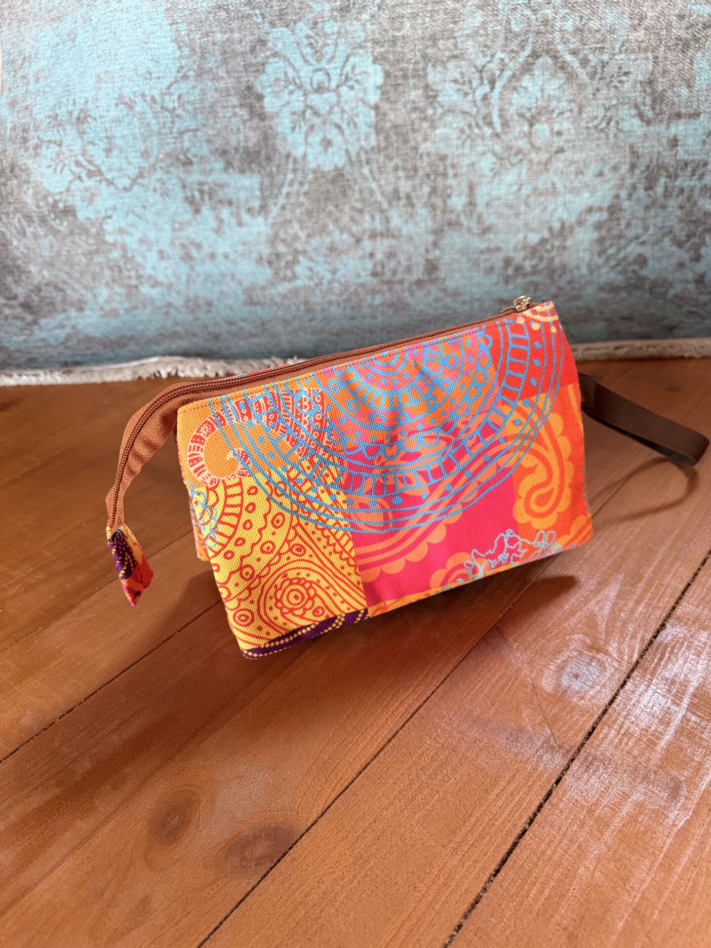 Mandala Desenli Makyaj Çantası (24*16 cm) Bol Gözlü, Dışı turuncu, İçi Lacivert Renkli